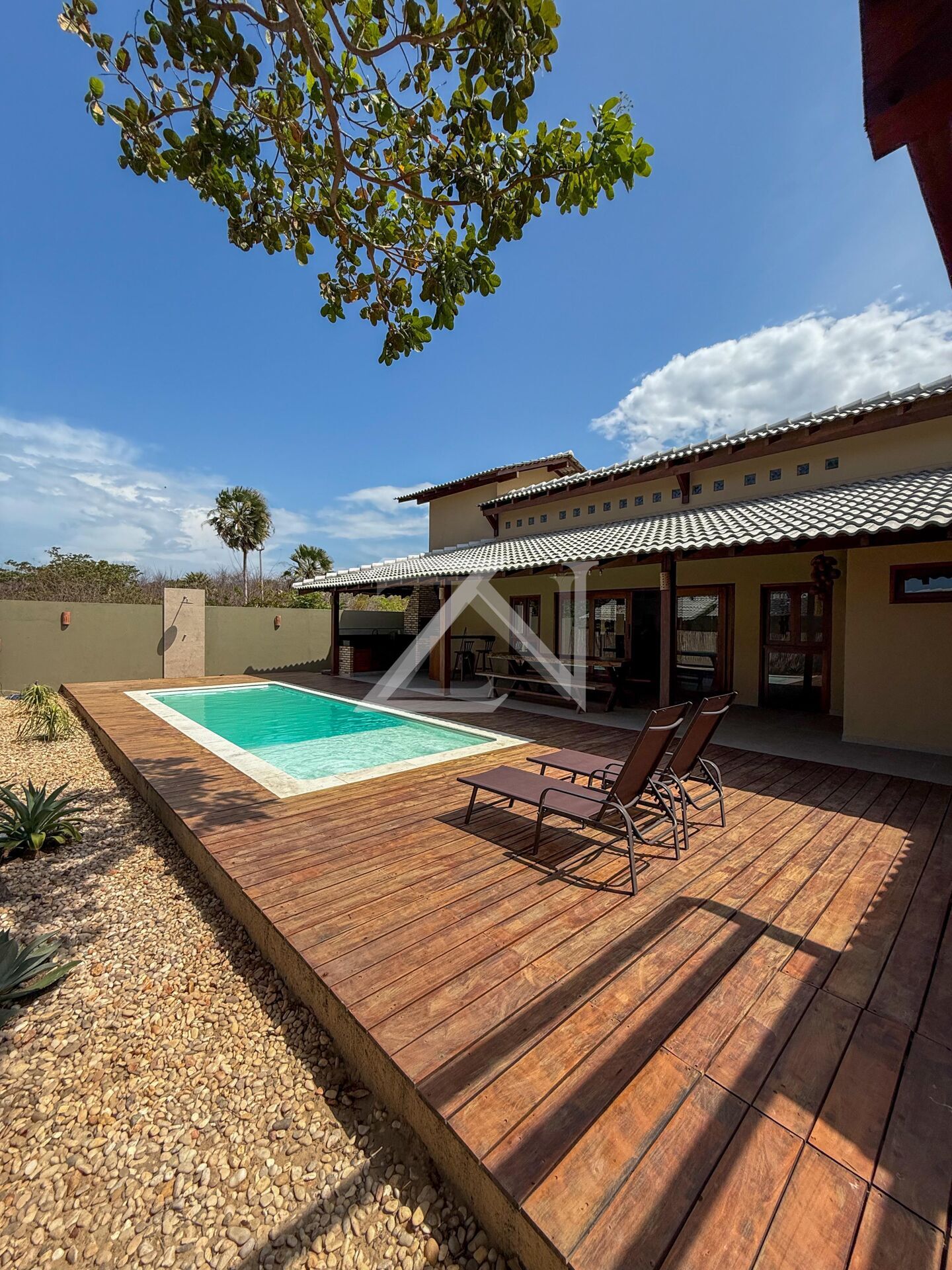 - Casa maior: piscina, área gourmet, sala integrada com a cozinha e 3 suítes.