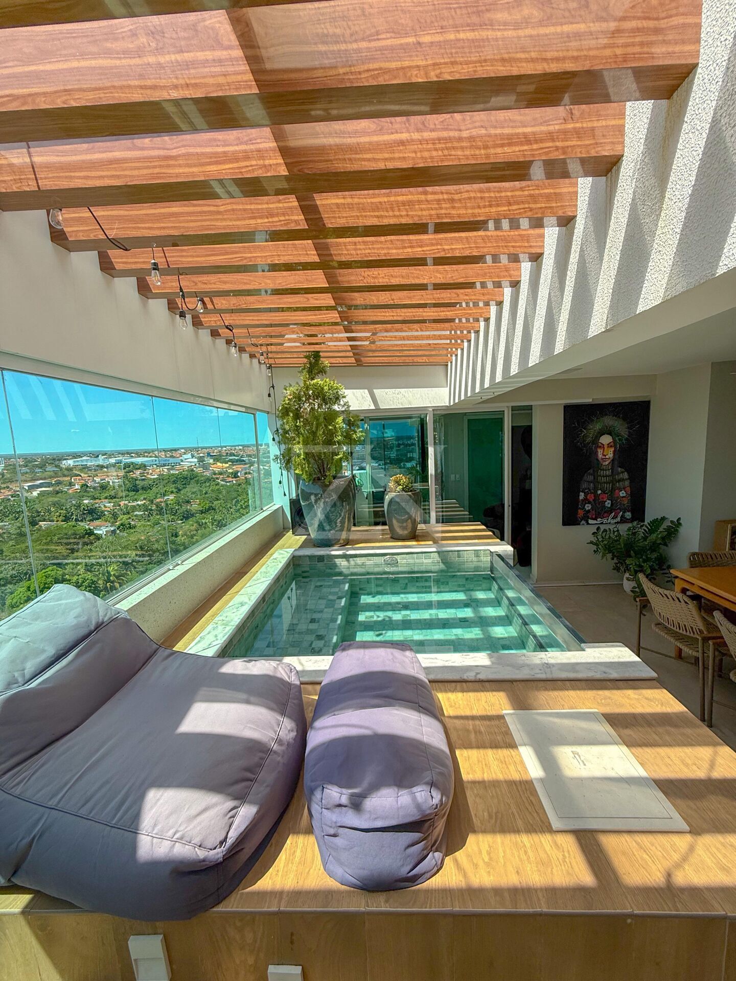 - Área externa com piscina da Igu e uma área de spa com banheiro completo, ideal para relaxar e aproveitar momentos de lazer.