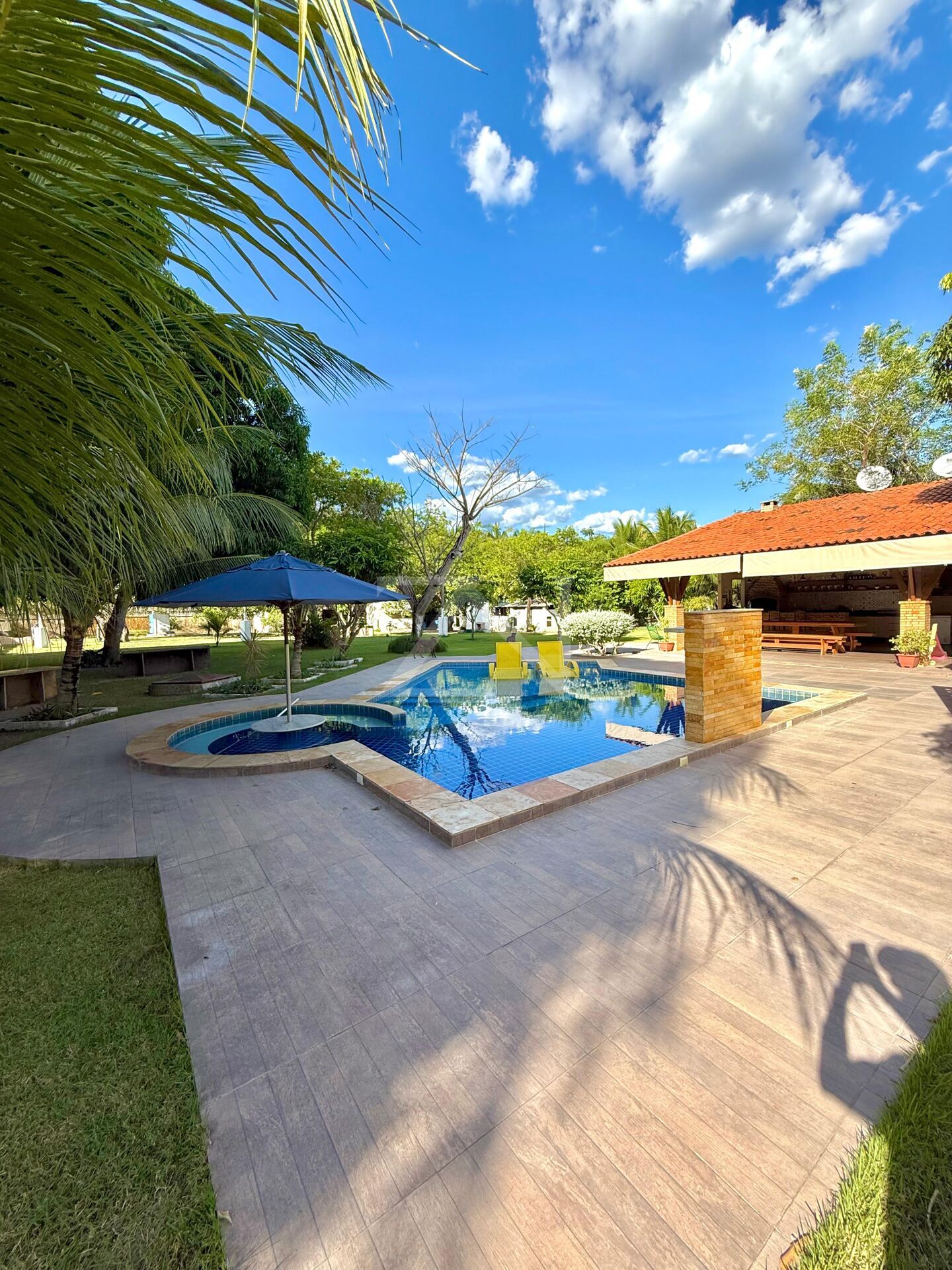 - Piscina ampla com deck molhado, churrasqueira, mesas em madeira de lei, e quadra de areia, ideal para atividades recreativas.